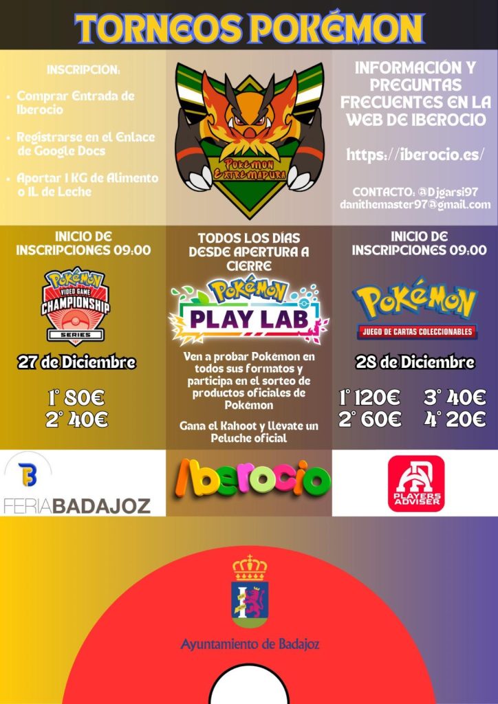 El equipo Pokémon Extremadura, con la colaboración de PLAYER ADVISER, GRUPO EMPRESARIAL 7 e IBEROCIO, organizarán dos torneos de POKÉMON, uno de VGC y otro de TCG.